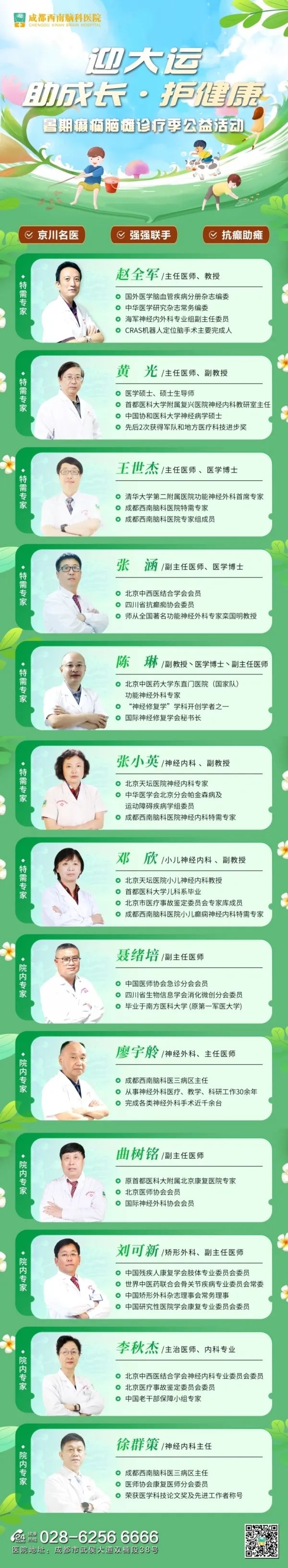 在大运会来临之际,我院联合成都市残疾人福利基金会, 开展“迎大运 助成长 护健康”暑期癫痫脑瘫诊疗季公益活动,每周邀请北京脑科医生坐诊,实行单病种限价收费,给予每一位癫痫、脑瘫、发育迟缓的患儿实质性的帮助,用爱心帮扶祖国花朵,用医术助力儿童成长,提高患儿及其家庭对癫痫脑瘫的正确认识,树立治疗的信心,让他们早日摆脱疾病的阴影!