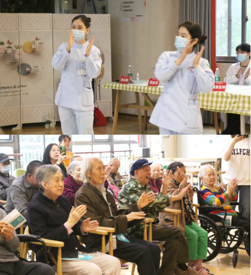 随着悠扬的音乐响起,康复科为老人们带来了一段八段锦。老人们目不转睛地看着,有的还跟着轻轻比划,脸上洋溢着孩子般的笑容。