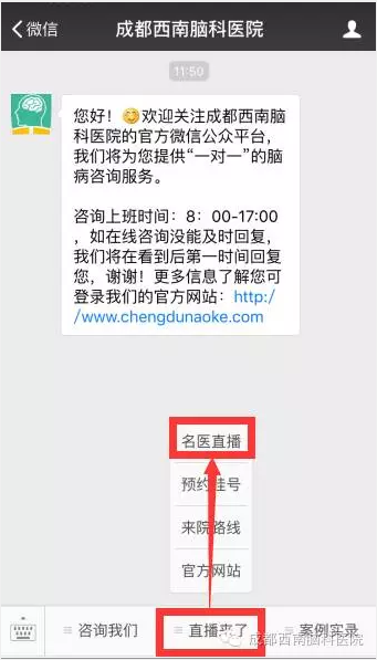 第二步:进入公众号,点击主菜单“直播来了”,选择子菜单”医生直播“即可进入《医生直播》的直播间观看直播