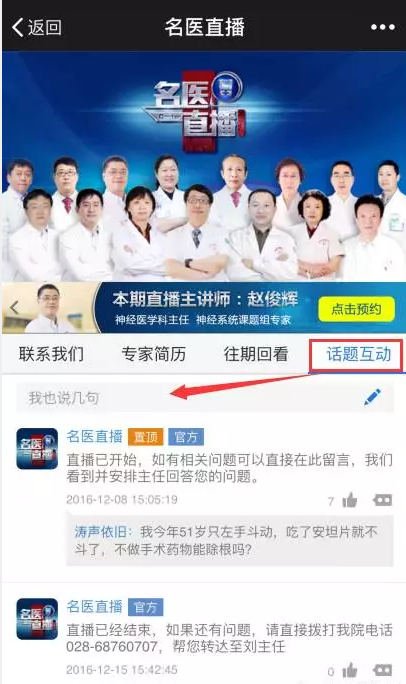 第三步:在观看直播的同时,你可以点击左侧“话题互动”菜单,输入你想要解答的问题,即可与直播医生进行互动。