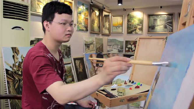 一间60平米大的房间,地上堆放着各种画笔和油彩,墙上挂着题材多样的油画,一切看上去整洁而又明亮,这就是张力中的画室。普通人尚不会有此成绩,而他更与常人有所不同。1992年某个夜晚,10个月大的张力中因高烧导致双耳失聪,后被确诊为重度型耳聋,因听力受损,缺少与人交流,张力中在语言表达上也受到了一些影响。在几乎无声的先进里,张力中上小学、中学,从未放弃,更因为对色彩的敏感,张力中逐渐开始接触绘画这门艺术,勤学苦练13年,期间,他先后登门向当地几名资深美术教师学习,从基础绘画技法到学习油画,张力中勤勤恳恳,从不懈怠。