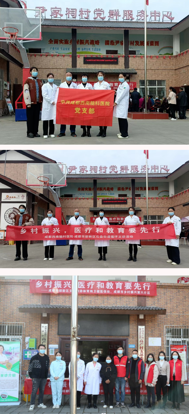 11月16日,我院“乡村振兴,医疗和教育要先行”义诊活动在邢雯梅院长、党支部王桂芝主任、廖宇舲主任和于学芬主任的带队下,走进了成都东部新区石盘街道尹家祠村、金鱼池村和高产村,为当地居民开展免费会诊,将健康送到百姓家门口,为居民解决脑健康问题,为乡村振兴添砖加瓦。