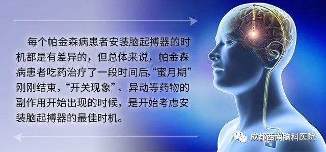 帕金森病进展到3~5年左右,伴随药物疗效明显下降、药物副作用增大或有严重异动症状出现时,是患者进行脑起搏器手术治疗帕金森病的最佳时机。如果患者能早点到正规医院就医,就更有希望减缓帕金森病带来的伤害。