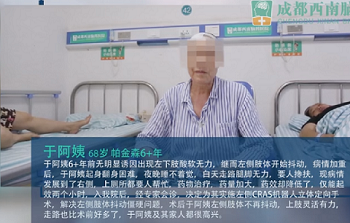 于阿姨6年前无明显诱因出现左下肢酸软无力,继而左侧肢体开始抖动,病情加重后,于阿姨起身翻身困难,夜晚睡不着觉,白天走路腿脚无力,要人搀扶,现病情发展到了右侧,上厕所都要人帮忙。