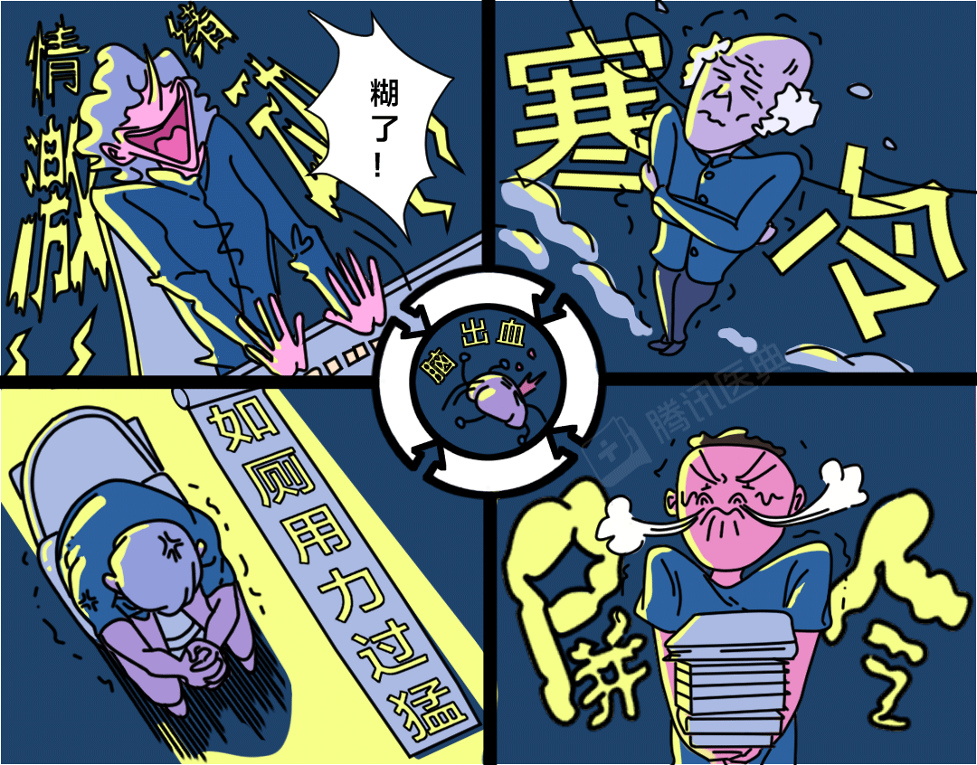 当情绪激动、天气寒冷、用力排便、屏气动作等使血压骤升时,本身硬化、薄弱的血管更容易破裂,一场脑出血,就这样发生了。
