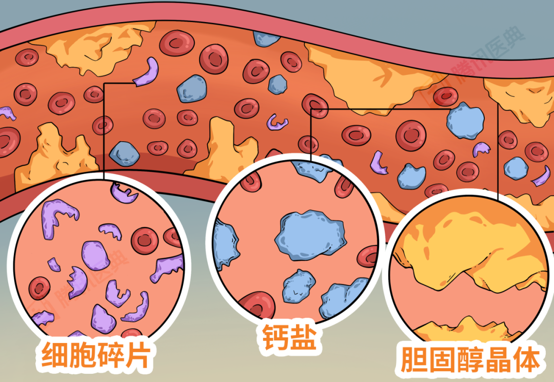 原本通畅无阻的“大路”,慢慢地增加了胆固醇晶体、细胞碎片、钙盐等开始作妖的“路障”,他们共同形成了一个物质:动脉粥样硬化斑块。